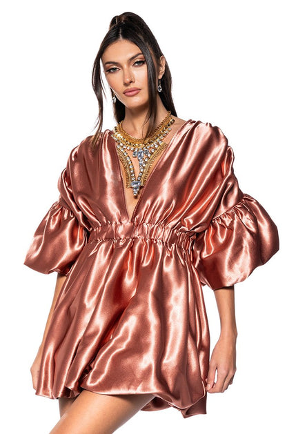 It is made from a sleek, non-stretch satin base fabrication and features a plunging neckline, ruched shoulder detailing, and long puffed sleeves. Complete with an elastic waistband, a bubble hem, mini length, and a pull-on silhouette.
